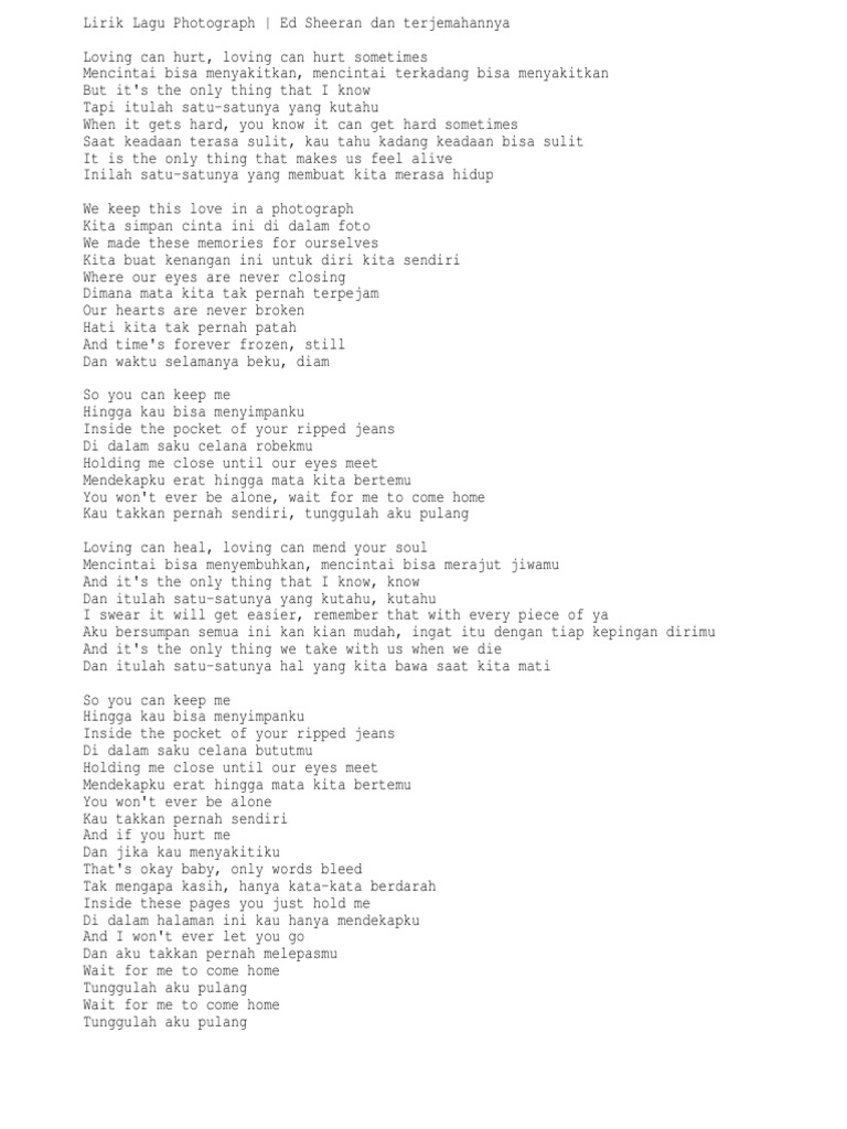 . Lirik Lagu Photograph - Ed Sheeran. You know it can get hard sometimes. After recording several versions with other producers Sheeran. We keep this love in a photograph.Loving can hurt sometimes. It is the only thing that makes us feel alive. Die deutsche Übersetzung von Photograph und andere Ed Sheeran Lyrics und Videos findest du. April 2015 als fünfte Single von Sheerans.